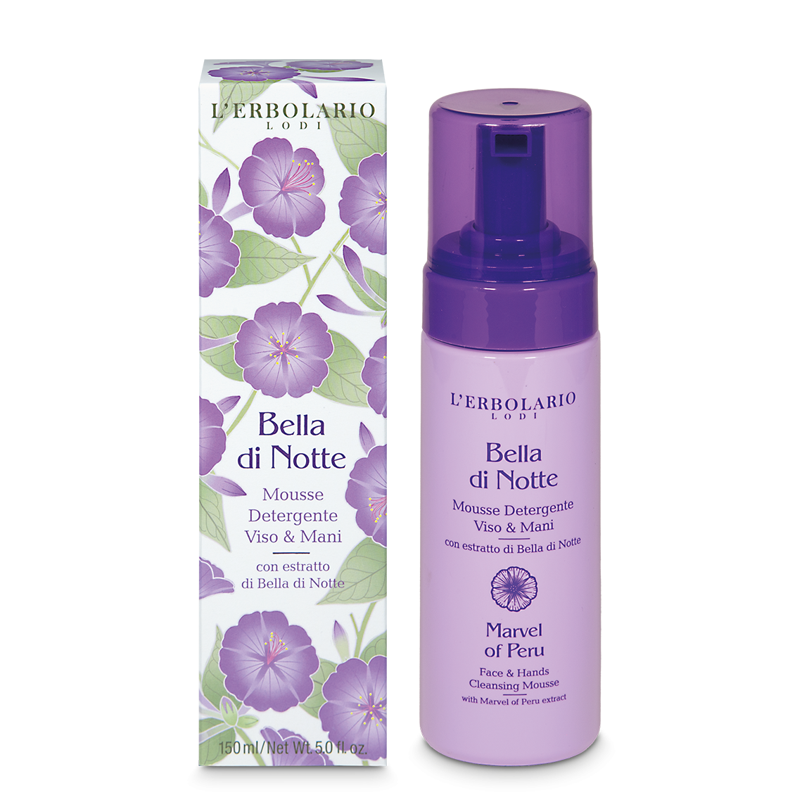 Una morbida Mousse detergente per il viso e per le mani, che abbina la delicata azione lavante ad una profumazione fiorita ma nel contempo leggera e soave. Contiene estratto di Bella di Notte e Acido Ialuronico ad alto peso molecolare, per contrastare la perdita di idratazione e lasciare la pelle morbida e fresca.